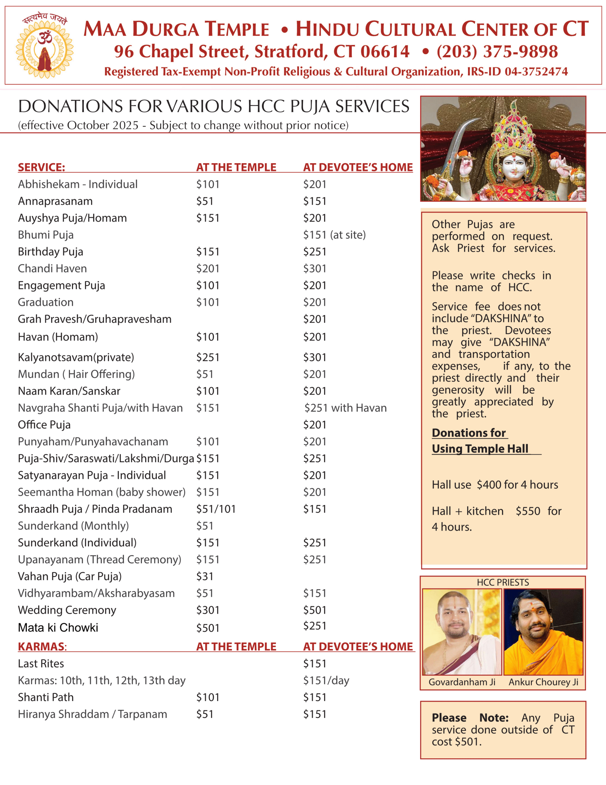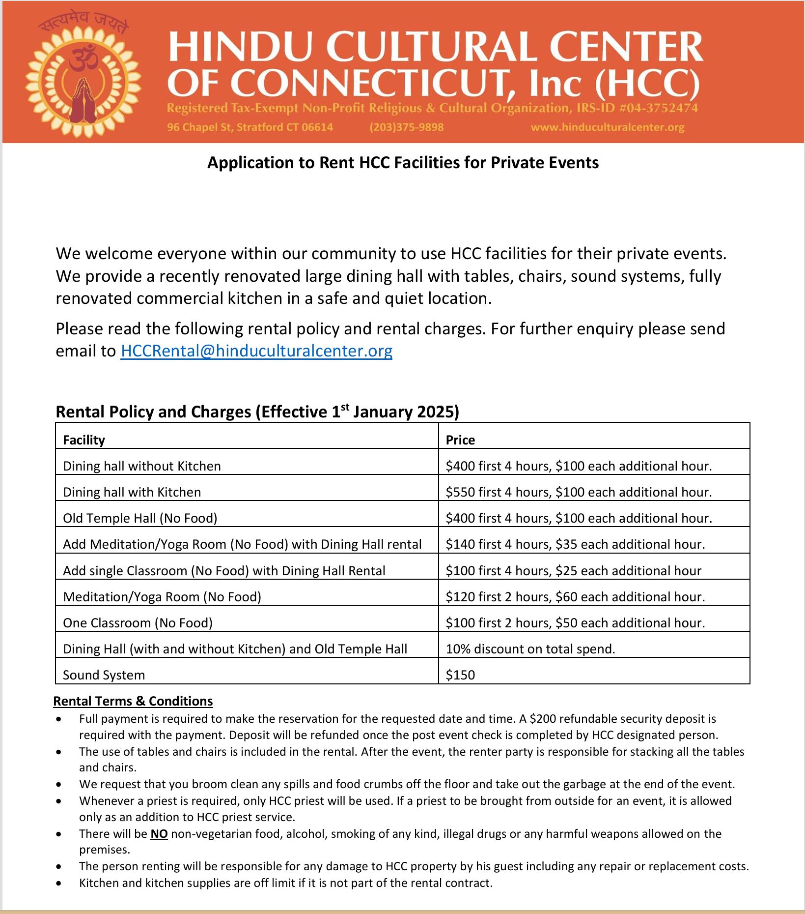 For further enquiry please send email to HCCRental@hinduculturalcenter.org